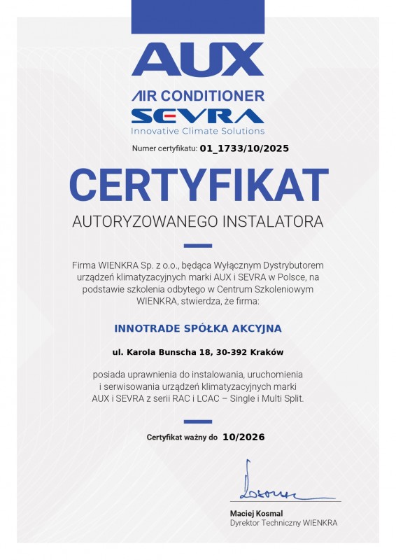 | AUX | Aero7 jest autoryzowanym instalatorem AUX | RAC i LCAC - Single i Multi Split | O1_1733/10/2025 | 10.2026 |