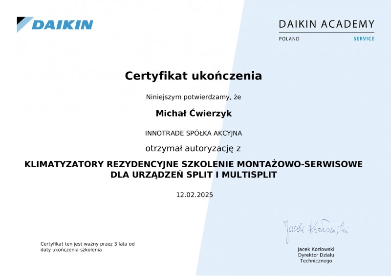 15-letnie doświadczenie w montażu klimatyzacji typu split i multisplit — od doradztwa po uruchomienie i szkolenie z obsługi.Uprawnienia
