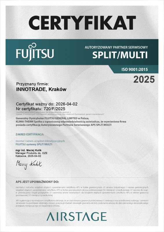 | FUJITSU | Aero7 jest autoryzowanym partnerem serwisowym FUJITSU | SPLIT/MULTI | 720/F/2025 | 04.2026 |