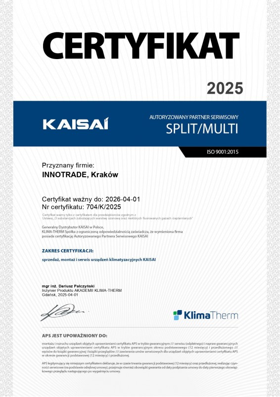 | KAISAI | Aero7 jest autoryzowanym partnerem serwisowym KAISAI | SPLIT/MULTI | 704/K/2025 | 04.2026 |