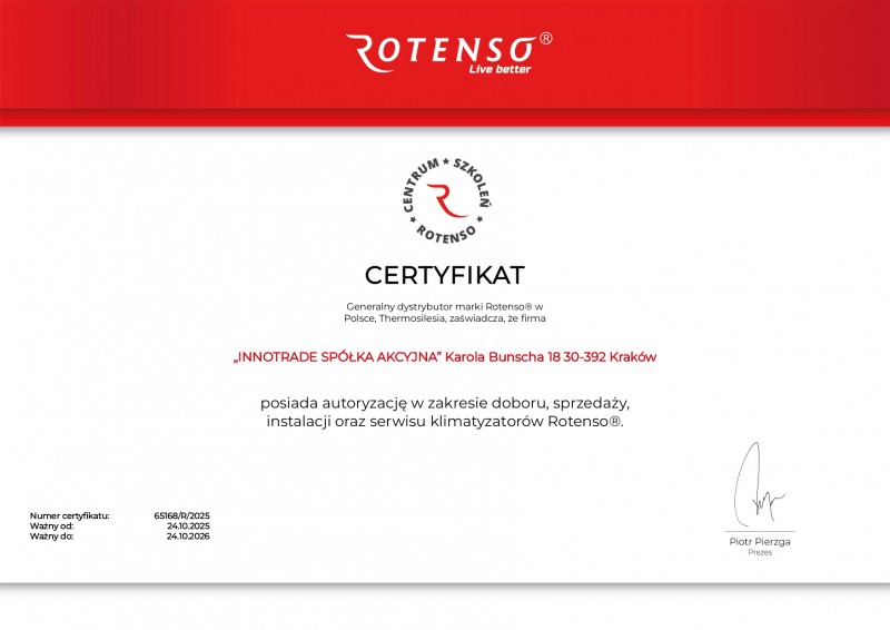 | ROTENSO | Aero7 jest autoryzowanym instalatorem i serwisantem ROTENSO | klimatyzatory | 65168/R/2025 | 10.2026 |