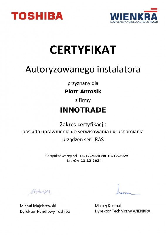 | TOSHIBA | Aero7 jest autoryzowanym instalatorem TOSHIBA | RAS | bez numeru | 12.2025 |